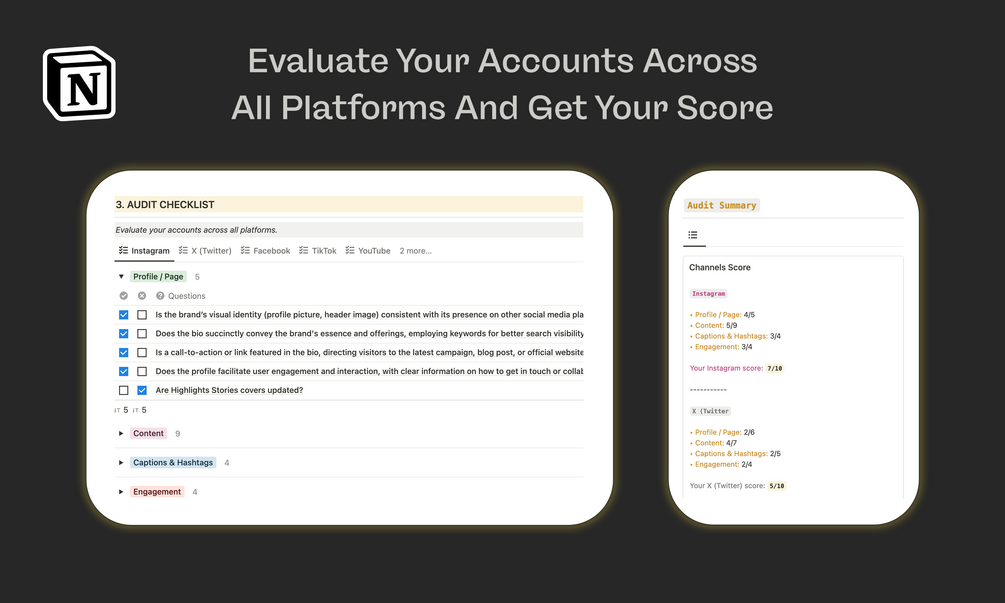 Benefit from a unique scoring system that rates each channel based on checklist-driven evaluations, offering a quantitative measure of your social media presence.